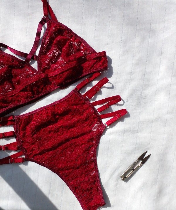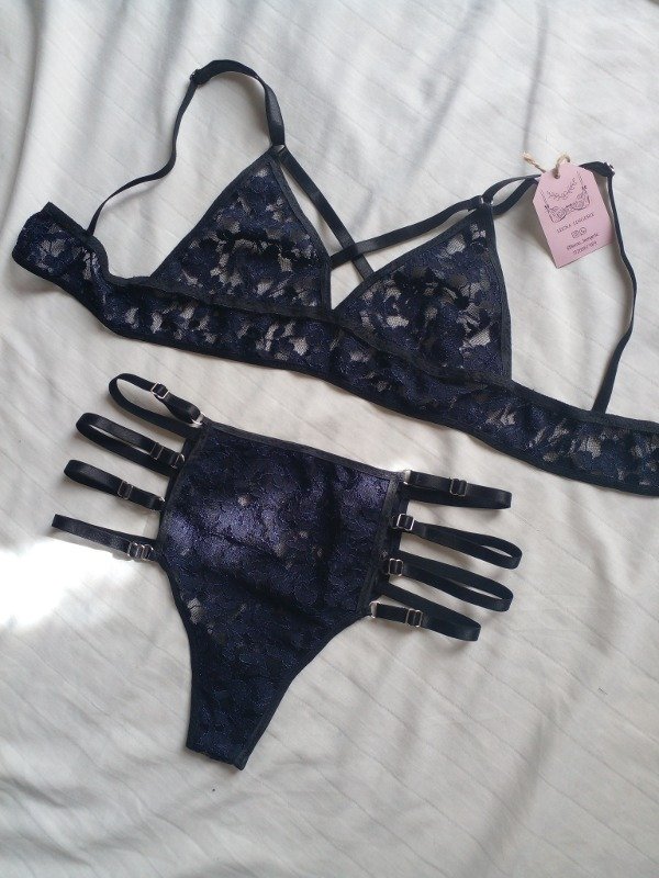 Conjunto de encaje con vedetina tiro alto con 4 elasticos regulables.